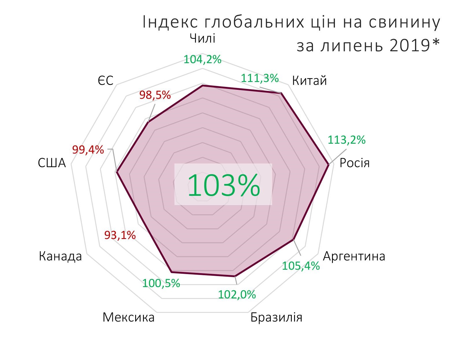 Ціни на свинину в Китаї у липні продовжили зростання: середня ціна за місяць зросла до 2,57 дол. США/кг живою масою (+11,3% до червневого показника). Станом на кінець липня ціна живця в Піднебесній сягнула 2,69 дол. США. Це на 10% більше ніж у перші дні місяця. Серед чинників тиску на ціну свинини — послаблення пропозиції внутрішньої (скорочення поголів’я через АЧС) та зовнішньої (торгівельні «війни» зі США та Канадою; їх частка у загальному імпорті у 2018-му — 7,2% та 13,4% відповідно).