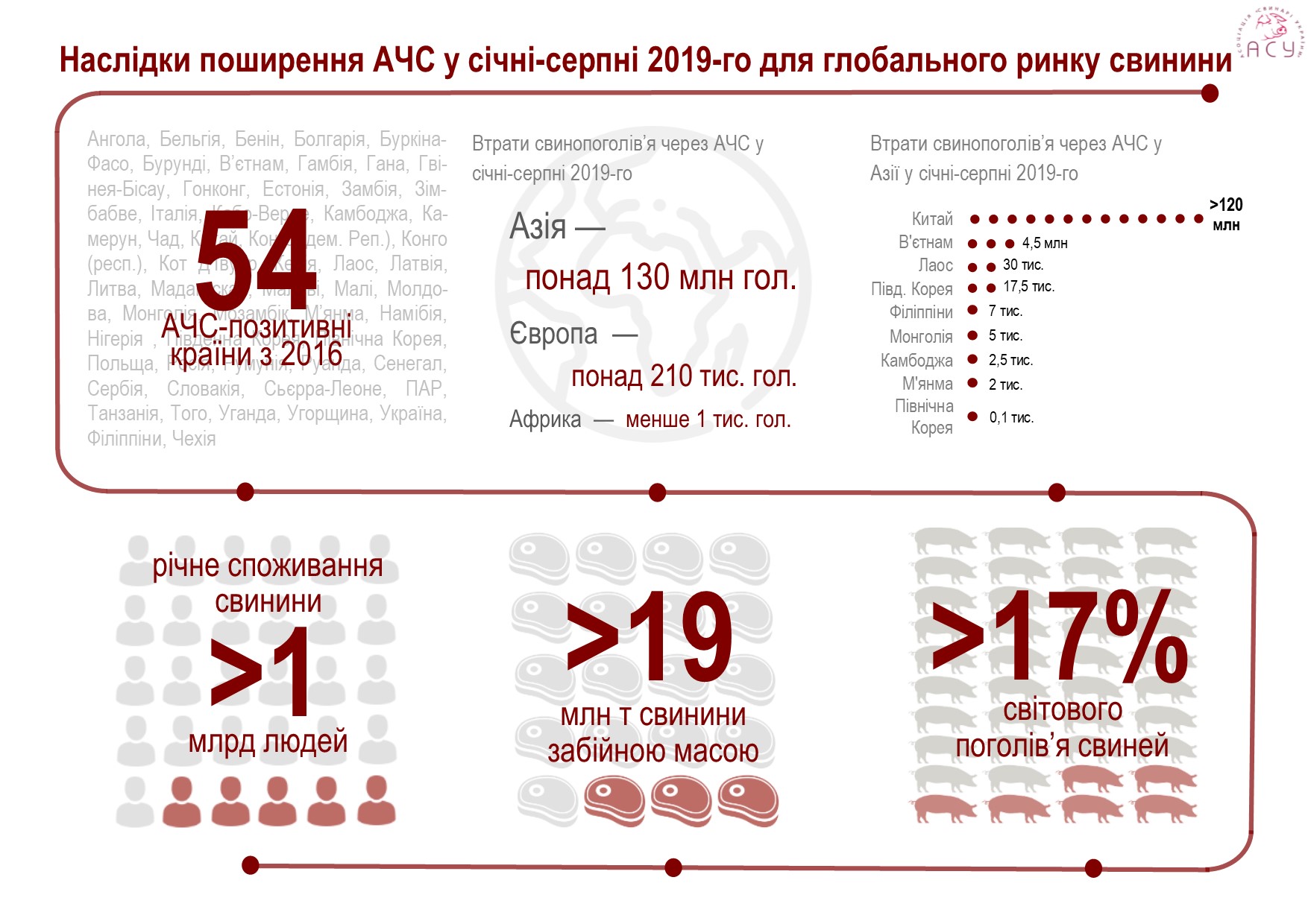 Сукупні втрати поголів’я свиней, за вісім місяців 2019-го в країнах в цілому перевищують 130 млн гол., що складає 17% від сукупної кількості цих тварин в світі. Такі величезні втрати еквівалентні 19 млн т. свинини забійної маси або ж – середньорічному споживанню свинини для понад 1 млрд людей*.