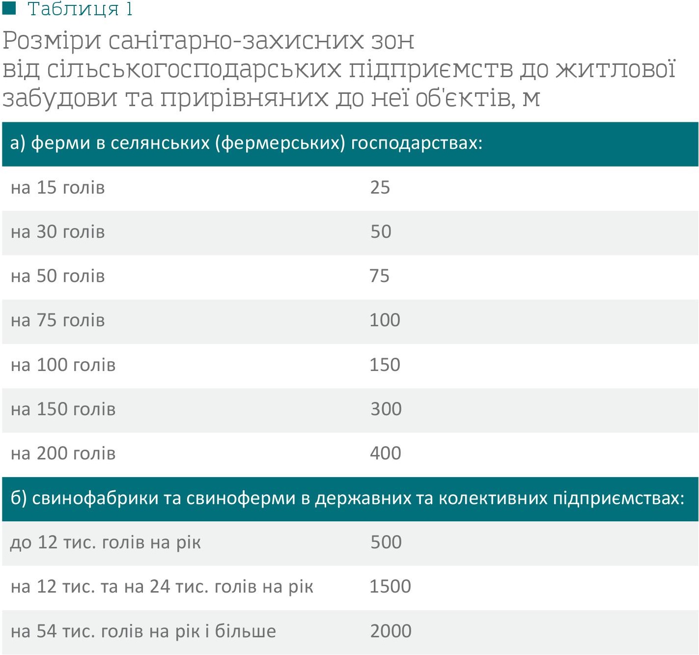 Також обов’язково має бути дотримана мінімальна відстань від господарства до житлових будинків — санітарнозахисна зона, яку визначено в Додатку 5 «Державних санітарних правил планування та забудови населених пунктів» (таблиця 1).
