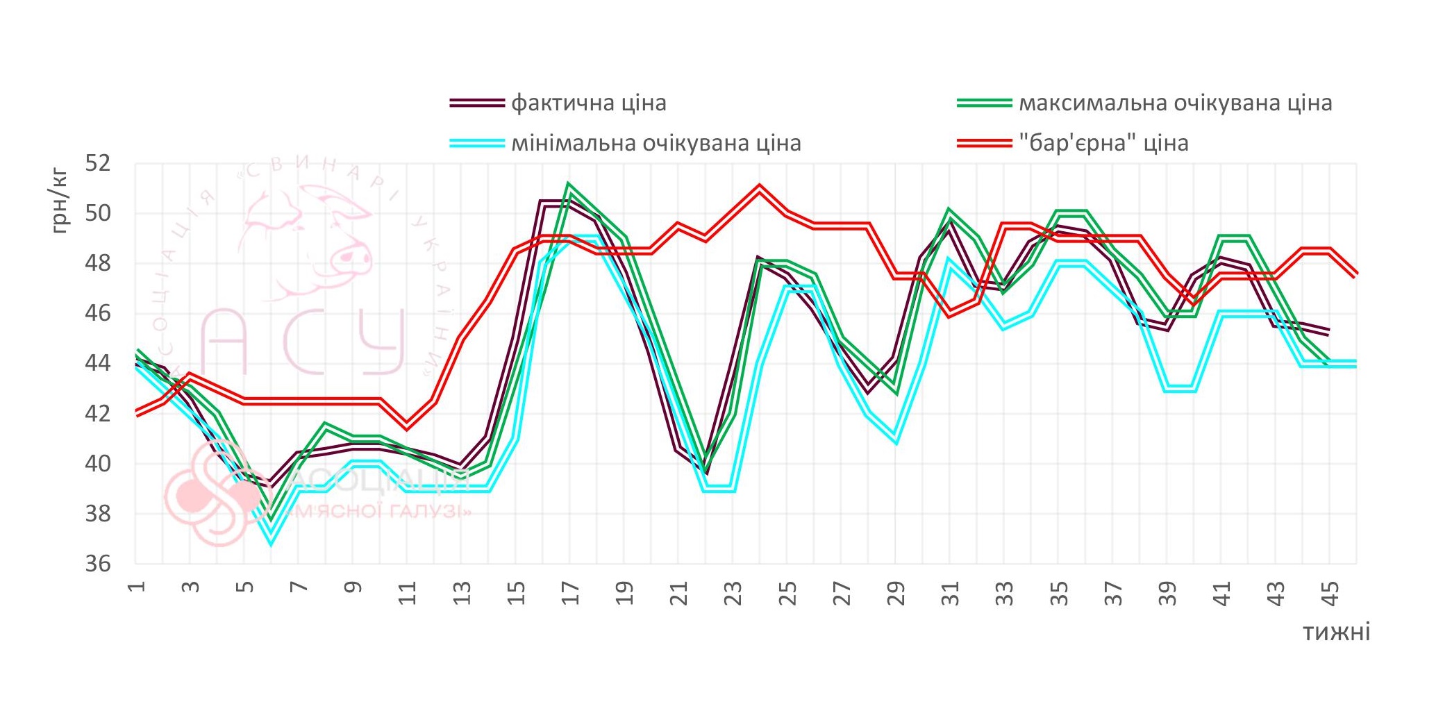 Протягом 45-го тижня більшість товарних партій реалізували за ціною попереднього, проте частина постачальників живця скорегували котирування на 0,25-1 грн/кг. При цьому, перегляд цін був як у бік пониження, так і в бік підвищення. З іншого боку, очікуване виробниками зміщення середньої ціни закупівлі угору не відбулося. Переробники зауважують, що пропозиція свиней забійних кондицій є достатньою, тоді як сезонне послаблення збуту окремих операторів було більшим за очікуване, в тому числі через посилення конкуренції в секторі. М’ясопереробники відзначають, що послаблення цін закупівлі не стимулює збут, а споживач «відволікається» на альтернативні види білку — рибу, гриби, дешевшу пташатина, в тому числі домашня.