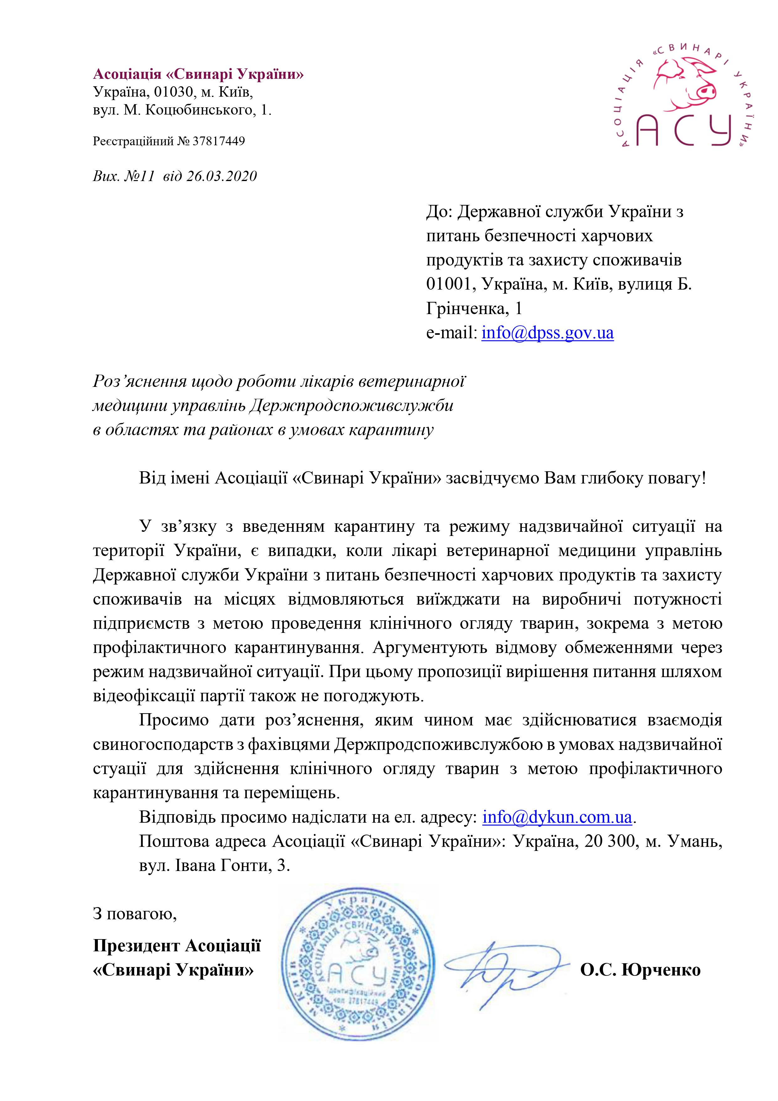 Асоціація «Свинарі України» звернулася до Держпродспоживслужби з проханням пояснити принципи роботи лікарів ветеринарної медицини районних та обласних управлінь відомства в умовах карантину.