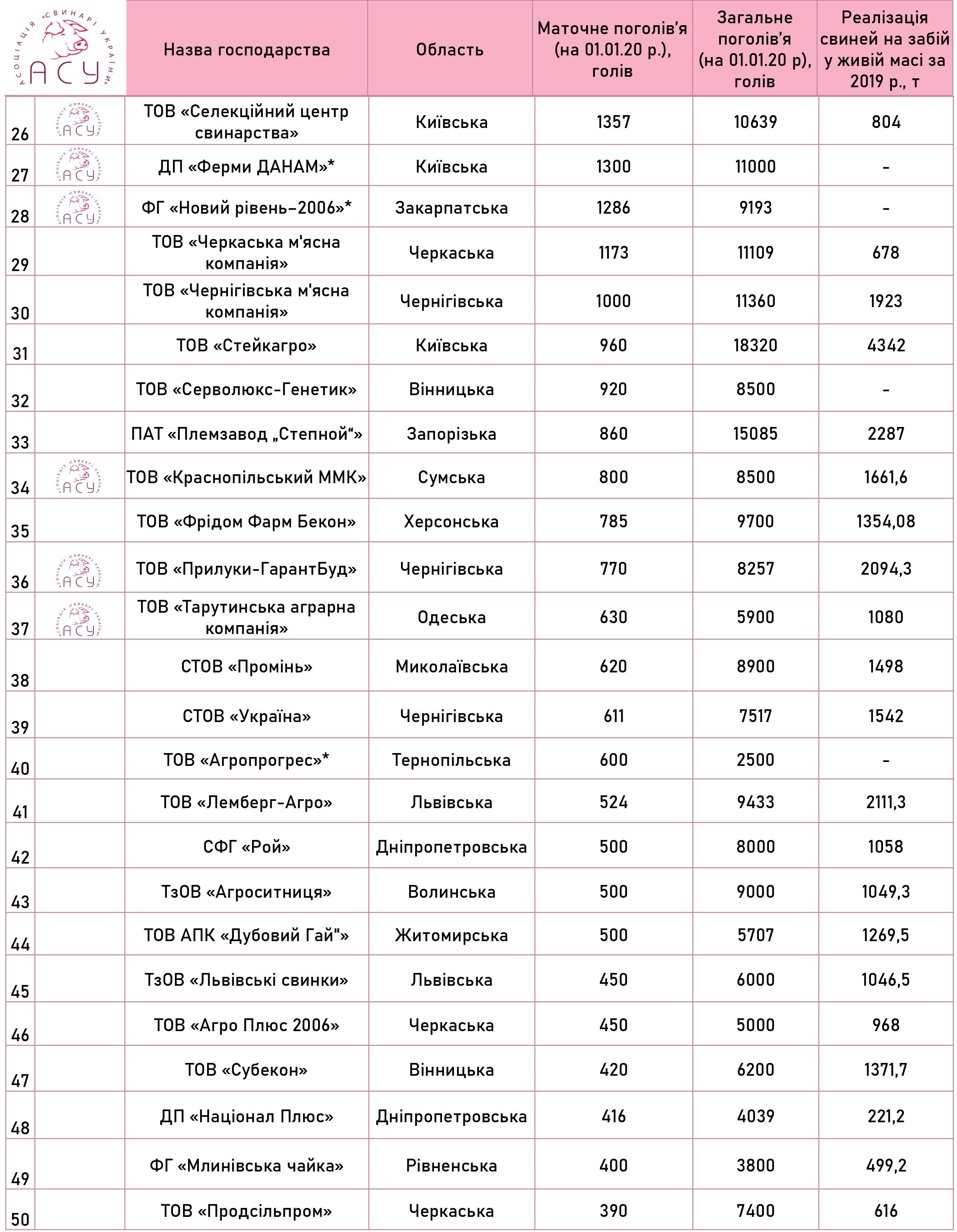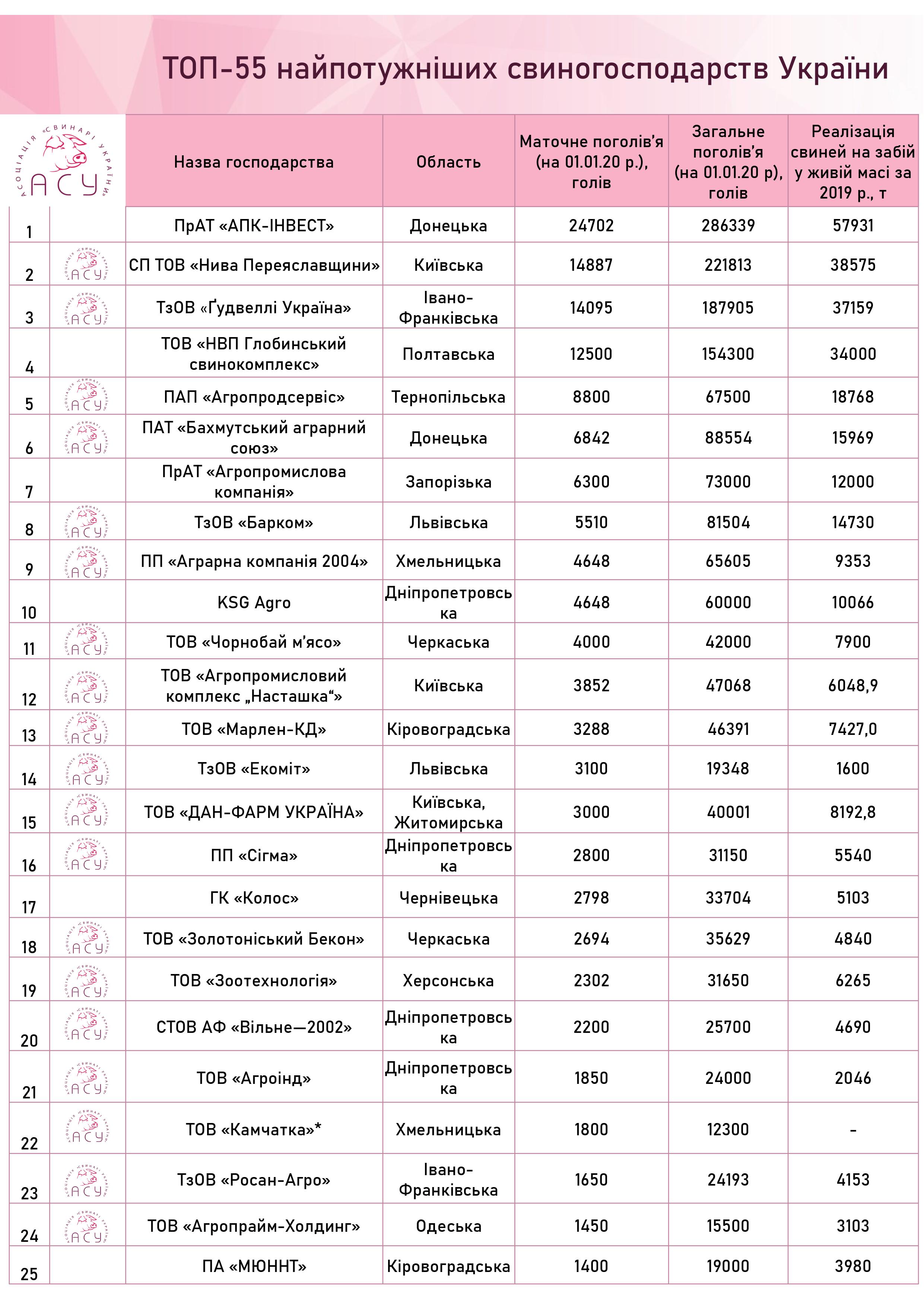 Асоціація «Свинарі України» спільно з сайтом pigua.info та журналом «Прибуткове свинарство» щороку складають рейтинг найпотужніших промислових свиногосподарств в Україні. Хто увійшов до числа найбільших гравців на ринку свинини на початку 2020-го?