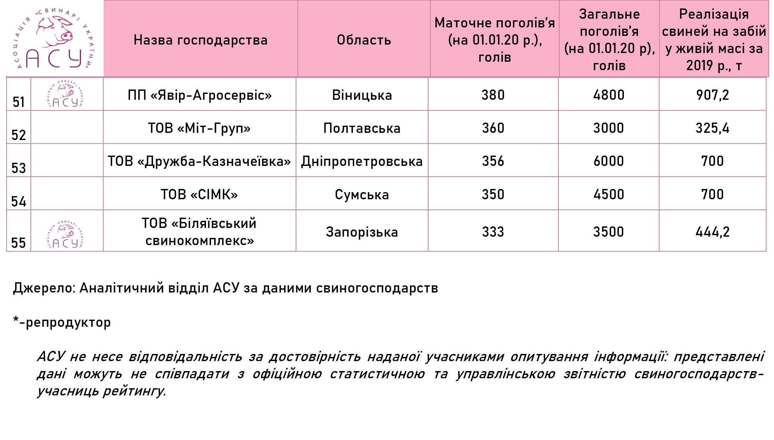 Незважаючи на тенденції скорочення числа промислових свиногосподарств в останні кілька років, сукупна кількість сільськогосподарських підприємств, що утримують свинопоголів’я складає близько 1,7 тисячі. Проте основний стрижень та, водночас, рушійну силу промислового свинарства представляє відносно невелике число свиногосподарств. Цьогорічний рейтинг повною мірою підтверджує цю тезу: сумарне маточне поголів’я підприємств, що увійшли до складу ТОП-55 складає понад 3/4 чисельності промислових свиноматок в Україні (майже 161 тис. голів), а сукупні обсяги річної реалізації свиней на забій — 68% пропозиції живця (351 тис. т), вирощеного в сільськогосподарських підприємствах.