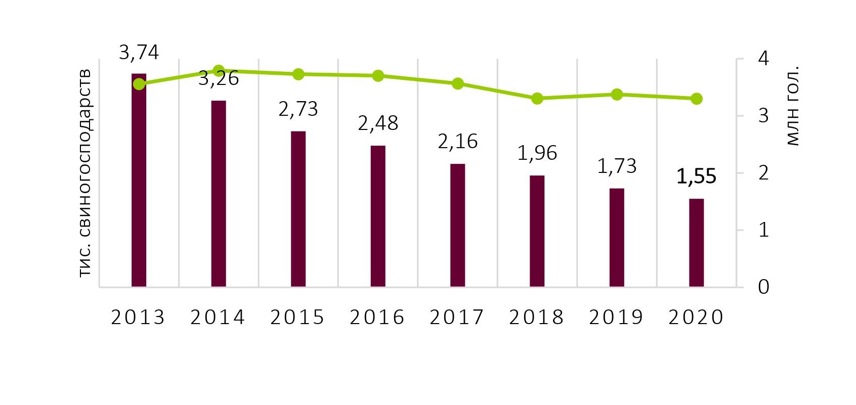 Про це чітко свідчать аналітичні дані. Так, якщо на 1-ше січня 2014-го 3,8 млн свиней утримували 3,26 тис. сільськогосподарських підприємств, то зараз 1,55 тис. підприємств вирощують 3,3 млн свиней. За кількістю операторів сектор «звузився» майже на 52,4% при скороченні поголів’я на півмільйона голів. І не забуваймо, що лише минулого року близько 120 тис. із них «забрала» АЧС, а не неефективність.