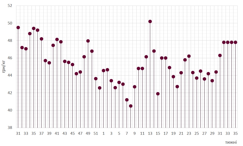 Факт: протягом останнього тижня серпня ціни на свиней забійних кондицій не зазнали змін. Так, більшість постачальників живця практично не переглядали ціни реалізації протягом серпня. Обмежені об’єми реалізації через менші прирости товарного поголів’я та «літня» середня забійна маса дозволила цінам залишатися на місці упродовж місяця. Винятком були лише Південні області: там на початку другої декади ціни сягали 50 грн/кг через локально обмежену пропозицію на тлі збільшення попиту за рахунок внутрішньої міграції.