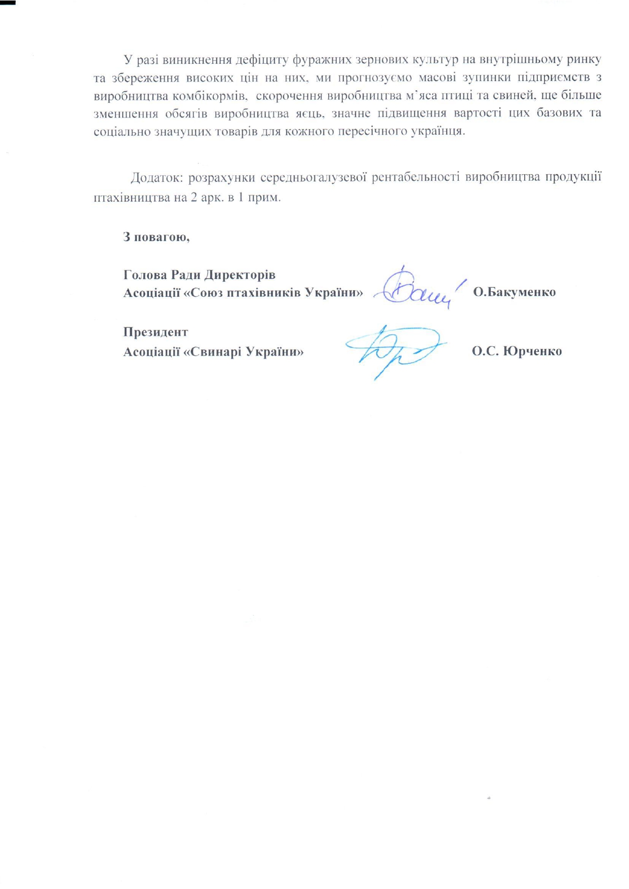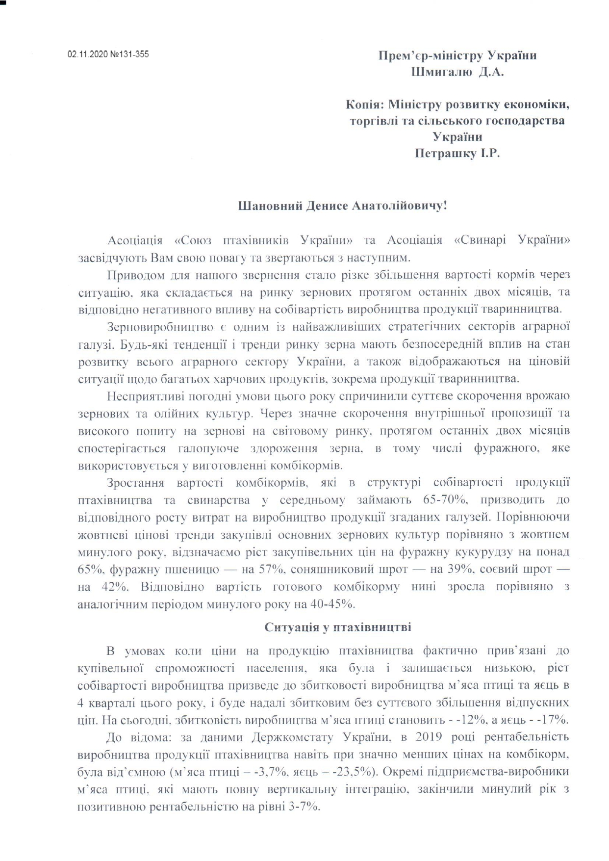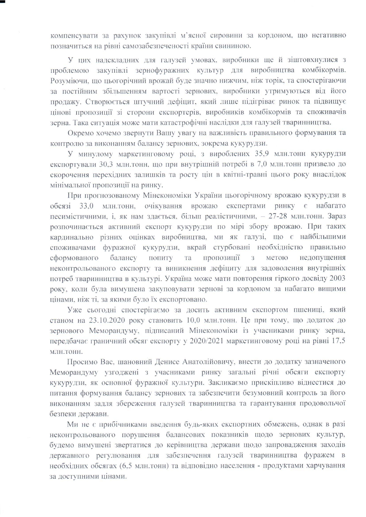 Аби не допустити подальшого здороження сировини та запобігти дефіциту фуражу на ринкуАсоціація «Свинарі України» спільно з Асоціацією «Союз птахівників України» звернулися до Прем’єр-міністра України Дениса Шмигаля з проханням внести до Меморандуму про узгодження позицій на ринку зерна загальні річні обсяги експорту кукурудзи.