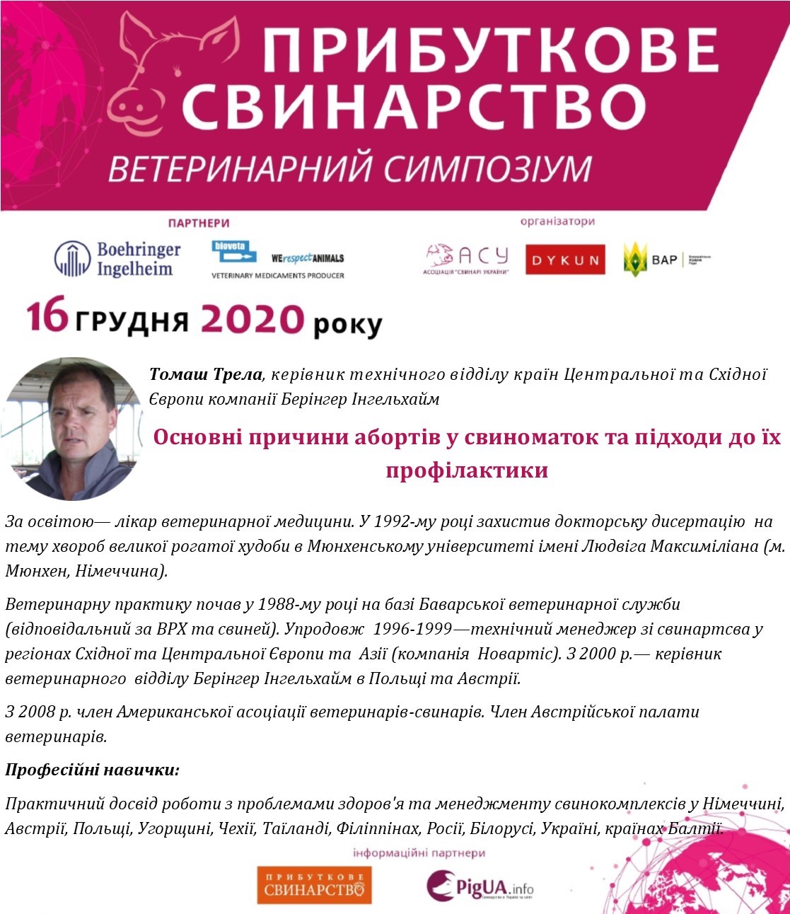 Про найбільш поширені причини абортів у свиноматок та практики їх профілактики розповість Томаш Трела, д.в.н., член Американської асоціації лікарів ветеринарної медицини, у ході Ветеринарного симпозіуму «Прибуткове свинарство».