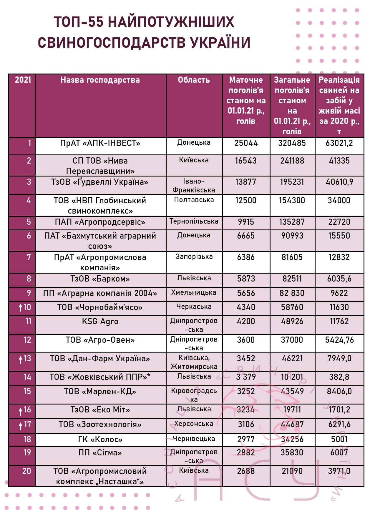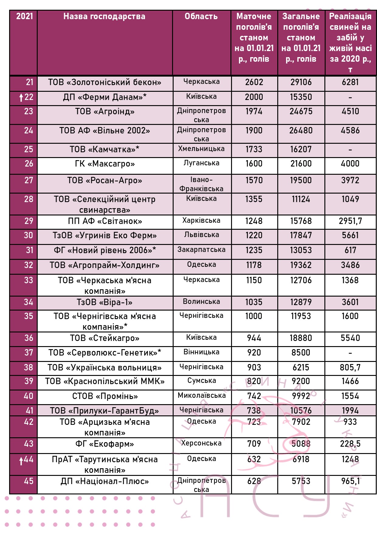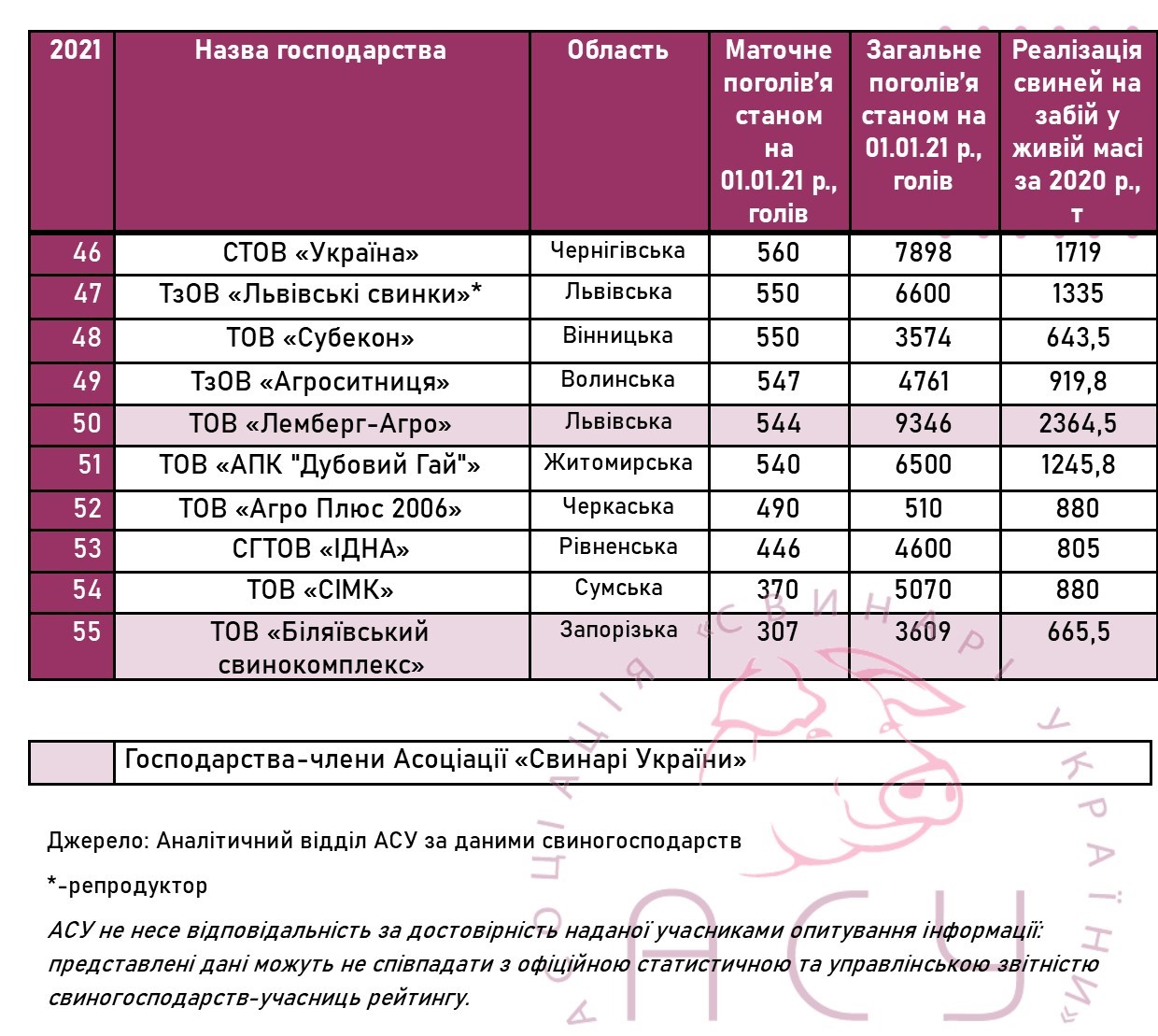 Зазначимо, що цей рейтинг не відображає всіх операторів галузі, що утримують від 300 свиноматок. Адже частина виробників поки не готові відкрито заявити про свої здобутки. Водночас, відстеження змін у такій вибірці дозволяє зробити загальні висновки про розвиток свинарства в Україні.