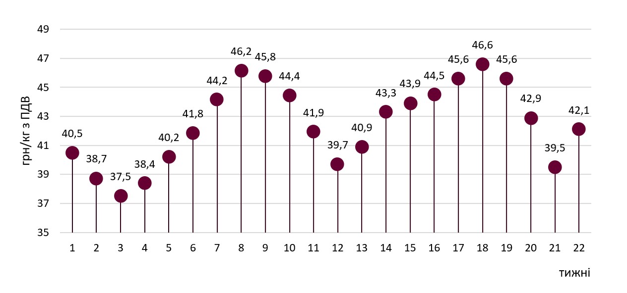 Пожвавлення серед закупівельників перехилило шальки терезів на користь виробників, тож більшість з них цього тижня реалізують живець по 41,5-43 грн/кг. Середня ринкова позначка зупинилася на рівні 42,1 грн/кг, що на 2,5 грн/кг чи понад 6% вище ніж попереднього тижня.