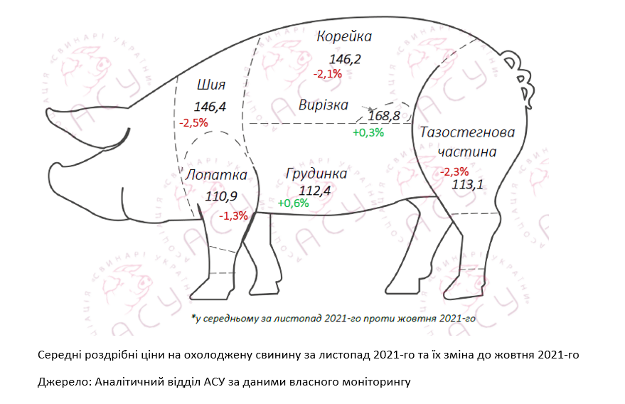 «Оскільки «дно» сезонного спаду цін на ринку свинини живою масою припало саме на першу половину минулого місяця, середня ціна закупівлі за підсумками листопада досить відчутно понизилася порівняно з попереднім місяцем — на 6,7% до 44,4 грн/кг ж.м. з ПДВ. З іншого боку, роздрібні ціни не встигли інтегрувати відновлення котирувань на ринку живця, яке почалося з середини листопада. Тож роздрібні ціни минулого місяця були більш сталими порівняно із динамікою закупівельних цін,» — коментують в Асоціації «Свинарі України».