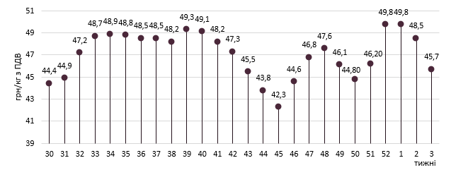 Очікування щодо подальшої цінової динаміки серед представників м’ясопереробки розділилися. Так, деякі прогнозують пониження цін закупівлі на 1-2 грн/кг наступного тижня, аргументуючи це сезонним послабленням торгівлі та тиском з боку імпортної сировини. Решта орієнтуються на стабілізацію цін у кінці місяця, оскільки кінцева реалізація йде планово, а подальше послаблення цін не сприятиме ані її покращенню, ані підвищенню фінансових результатів по ланцюгу доданої вартості.