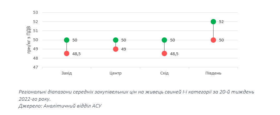 За результатами торгів минулого тижня оператори ринку свинини констатують різноспрямований рух цін закупівлі. Хоча близько половини постачальників живця зберегли ціну на рівні попереднього тижня, решта відзначила різноспрямований рух котирувань: низка виробників свинини минулої п’ятниці переглянули ціну на 0,5-1,5 грн/кг як у бік пониження, так і в бік підвищення. Не зважаючи на деяку неоднозначність цінової динаміки, цього тижня ціна на свинину живою масою майже повсюдно закріпилася в межах 48,5-50 грн/кг. Так, хоча епізодично зустрічаються як нижчі, так і вищі ціни, проте більшість товарних партій на Заході та Сході «розписали» в зазначених цінових межах, а в Центрі мінімальна цінова позначка була на півгривні вищою. Єдиний регіон, який дещо «вибивається» з загальної картини ― Південь, де ціни коливаються в межах 50-52 грн/кг.