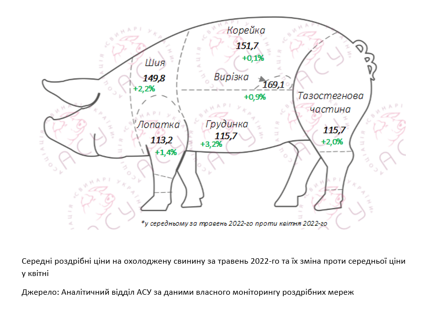 «Характер цінової динаміки охолодженої свинини у травні відрізнялася від квітневого: напередодні Великодня приріст цін відбувався поступово, тоді як травень почався зі скорегованих у бік підвищення цінників. При цьому протягом місяця деякі свинячі напівфабрикати (ошийок, грудинка та тазостегнова частина) знизилися в ціні на 1-1,5 грн/кг. Водночас, корейка, подешевшавши на 3,3 грн/кг з початку травня, за підсумками місяця зупинилася на рівні середньої ціни квітня — 151,7 грн/кг», — додають аналітики Асоціації.