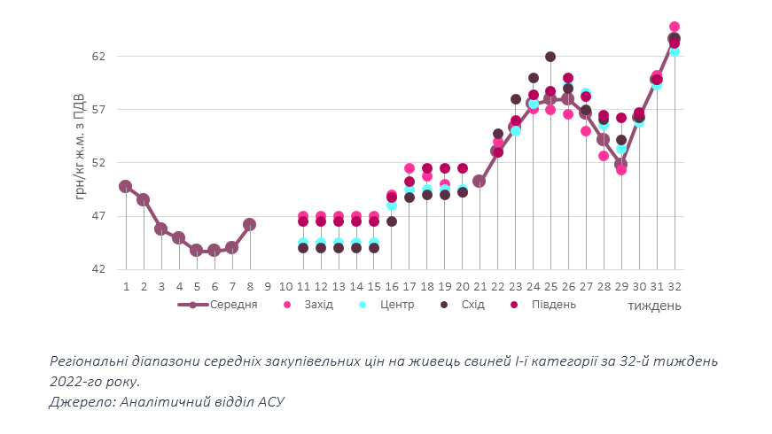 Торги на 32-ий тиждень завершилися подальшим підвищенням цін закупівлі: більшість товарних партій цього тижня реалізували в межах 62-65 грн/кг. Так, на Сході та Заході країни ціни тяжіли до позначки 65 грн/кг, тоді як у центральних областях переважно становили 62-64 грн/кг.