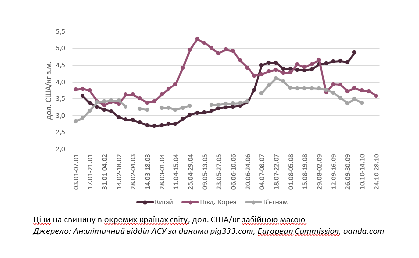 Позитивна цінова динаміка на ринку свинини Китаю продовжилася у третьому кварталі, що підживило і загальний рівень інфляції споживчих цін. Так, ціни на свинину в Китаї почали зростання ще у кінці серпня з позначки 4,52 дол. США/кг з.м. і не зважаючи на випуск на ринок свинини з держрезервів, що мало стабілізувати ціни, на початку жовтня вона сягнула 4,88 дол. США. Наближення Дня утворення КНР (1-ше жовтня) та тиждень після ціни «підживлював» підвищений попит на свинину у період приготування до та безпосередньо у святковий період, як і сезонний приріст споживання свинини у холоднішу пору року. Крім цього, аналітики констатують, що свинарі значно стриманіші у пропозиції свиней на забій і все більше повертаються до відгодівлі свиней до важчих кондицій (до 150 кг проти 120 кг та менше раніше), щоб збільшити отримувані прибутки та компенсувати збитки початку року.
