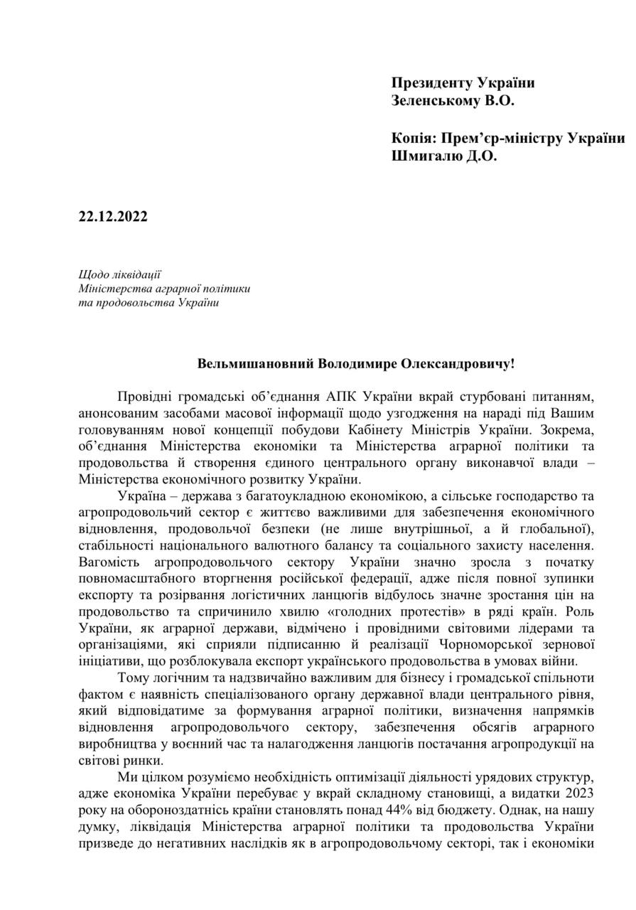 27 аграрних асоціацій просять президента та прем’єра не ліквідовувати Міністерство аграрної політики