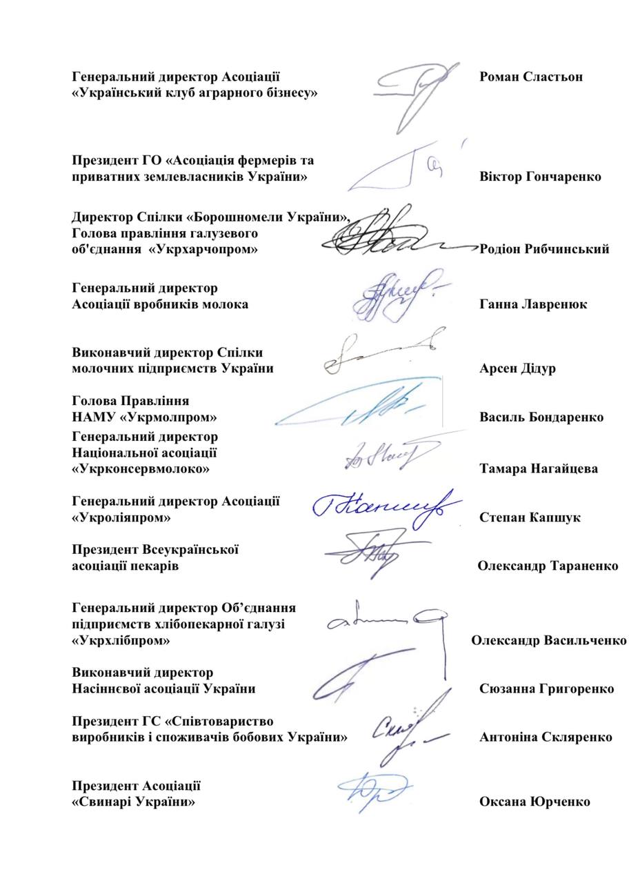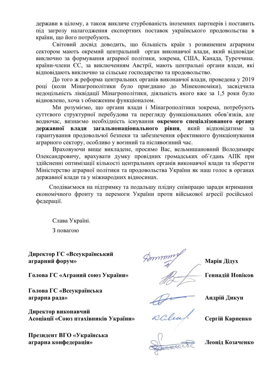 У своєму зверненнні аграрна спільнота наголошує, що "ліквідація Міністерства аграрної політики та продовольства України призведе до негативних наслідків як в агропродовольчому секторі, так і економіки держави в цілому, а також викличе стурбованість іноземних партнерів і поставить під загрозу налагодження експортних поставок українського продовольства в країни, що його потребують».