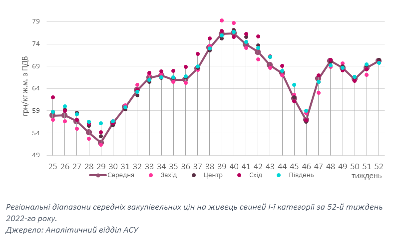 Торги на 52-й тиждень завершилися подальшим підвищенням цін на свинину живою масою. Так, низка операторів цього тижня вийшли на ринок із меншими ніж минулого тижня об’ємами пропозиції. На тлі цього та жвавішої заготівельної активності ціни на свиней забійних кондицій додали 0,5-2,5 грн/кг до позначки попереднього тижня. Напередодні Нового року ціни закупівлі в усіх регіонах узгодилися, адже більшість товарних партій реалізовували межах 69-71 грн/кг, а середньозважена ціна реалізації зупинилася на позначці 70,15 грн/кг, що на 2,2% вище ніж тижнем раніше.