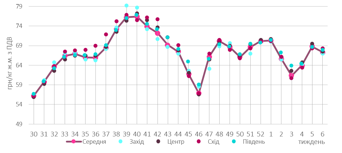 Минулотижневі торги для операторів вітчизняного ринку живця проходили дещо напруженіше ніж попередні, а ціни закупівлі послабилися на 1-2 грн/кг. Так, більшість товарних партій цього тижня реалізують в діапазоні 66,5-68 грн/кг , а середньозважена позначка «втратила» 2% та склала 67,3 грн/кг. Хоча епізодично зустрічалися цінові пропозиції, як вище, так і нижче згаданого цінового коридору, вони стосувалися тварин, чия маса не відповідала стандартним забійним кондиціям.