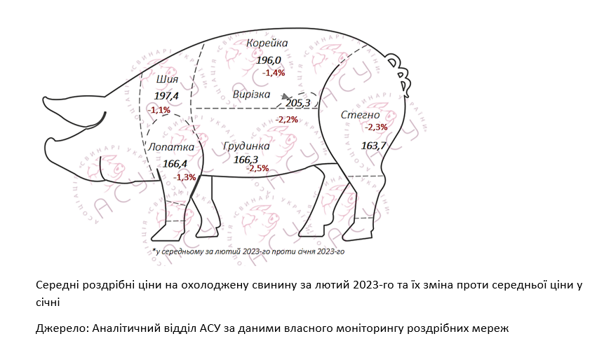 Ціни охолоджених свинячих напівфабрикатів на полицях супермаркетів у лютому були нижчими ніж в січні: «Так, якщо у перший місяць року кілограм свинини в середньому коштував 179,1 грн/кг, то за підсумками лютого середня ціна склала 176,6 грн/кг, знизившись на 2,5 грн/кг чи 1,4%. При цьому найпомітніше подешевшали стегнова частина (мінус 3,8 грн до 163,7 грн/кг), грудинка (мінус 4,2 грн/кг до 166,7 грн/кг) та вирізка (мінус 4,5 грн/кг до 205,2 грн/кг), тоді як ціна ошийка порівняно з січневою знизилася на 1% чи 2 грн/кг (до 197,4 грн/кг)», ― уточнюють аналітики АСУ.