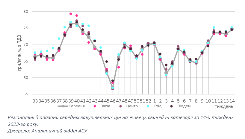 Останні торги березня завершилися позитивним коливанням цін закупівлі. Так, оператори переглянули котирування у бік підвищення на 1-3 грн/кг, тож кілограм свинини забійною вагою цього тижня коштує переважно 74-75 грн/кг в усіх регіонах країни. Хоча епізодично зустрічаються як нижчі, так і вищі цінові пропозиції, середньозважена ціна реалізації зупинилася на рівні 74,65 грн/кг, що на 2,2% вище ніж тижнем раніше.