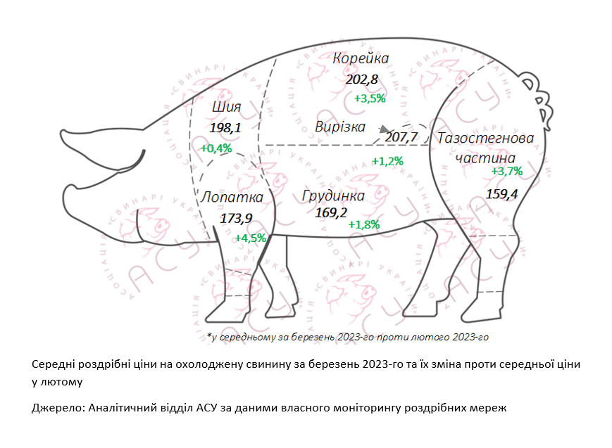 Середня ціна кілограму охолодженої свинини у березні склала 180,3 грн/кг, що на 2,1% чи 3,7 грн/кг вище за лютневий показник, констатують аналітики галузевого об’єднання промислових виробників свинини: «Найпомітніше подорожчання торкнулося бюджетніших лопатки та тазостегнової частини, середня ціна яких у березні зросла на 7,5 грн/кг та 5,7 грн/кг проти лютневої позначки (+4,5% та 3,7%, відповідно). На 3,5% подорожчала корейка, ціна якої додала 6,8 грн/кг у середньому та повернулася до жовтневого рівня. Решта частин обмежилися приростом в межах 0,5-2%», ― повідомляють аналітики АСУ.
