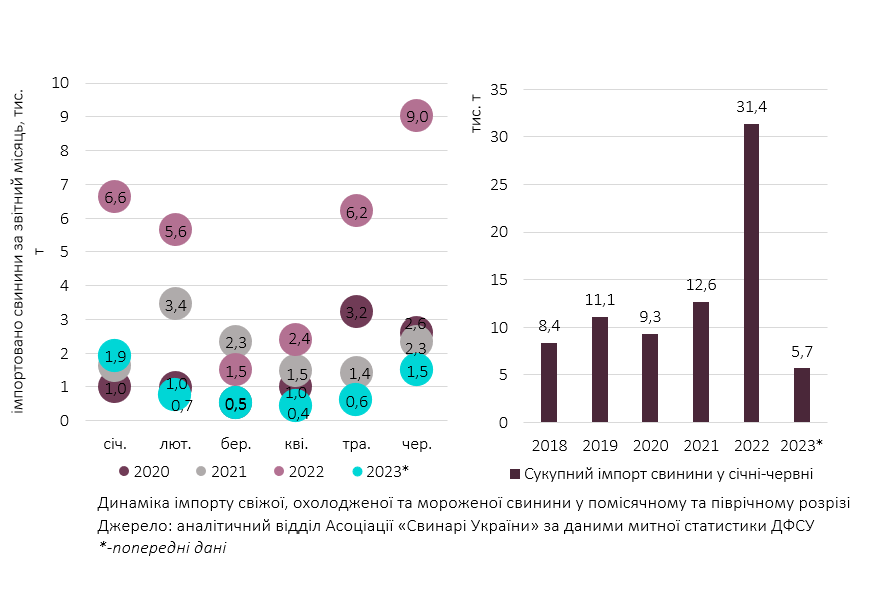 Цьогорічні темпи імпорту свинини істотно відстають від показників попереднього року. Так, за перше півріччя 2023-го до України завезли 5,7 тис. т м’яса свиней з-за кордону проти понад 31 тис. т у першій половині 2022-го.