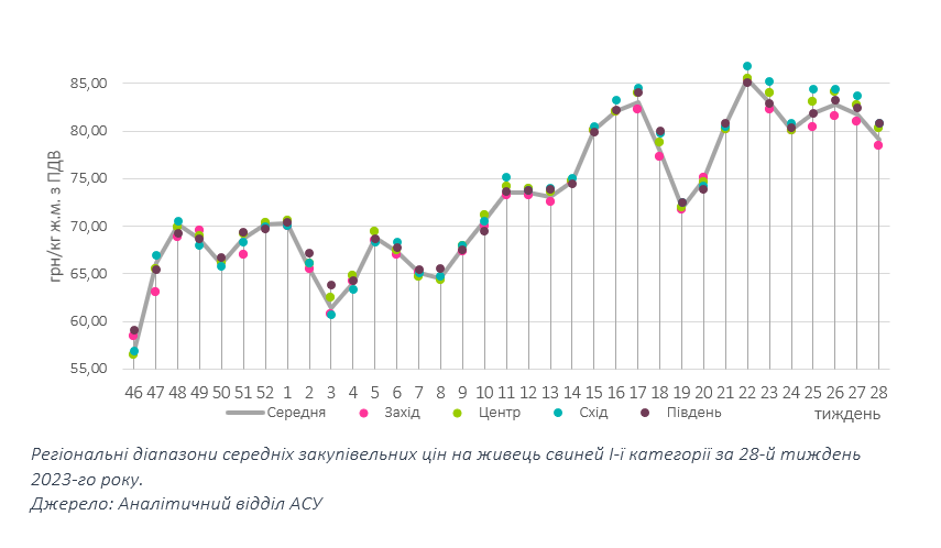 Торги минулої п’ятниці завершилися зсувом цін на свиней забійних кондицій на 2-3 грн/кг у бік пониження. Тож хоча в Центрі, на Півдні та на Сході кілограм свинини живою масою переважно коштував 80 грн/кг та вище, епізодично зустрічалися і нижчі ціни, а на Заході котирування цього тижня коливалися між 77 та 80 грн/кг. Відповідно, середньозважена ціна зупинилася на рівні 79,1 грн/кг чи на 3,2% нижче минулотижневої позначки.