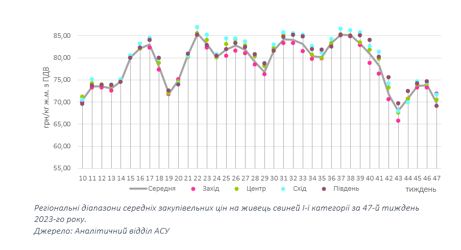 За підсумками торгів минулого тижня, ціни на свинину живою масою «просіли» порівняно з попередніми тижнями. Так, на Сході та в Центрі ціни переважно тяжіють до 70-71 грн/кг, хоча епізодично зустрічаються і вищі, на Заході — найчастіше до 69-69,5 грн/кг, проте подекуди звучали і нижчі цінові пропозиції. Середньозважена ринкова позначка зупинилася на рівні 69,9 грн/кг, що на 5,3% нижче ніж тижнем раніше.