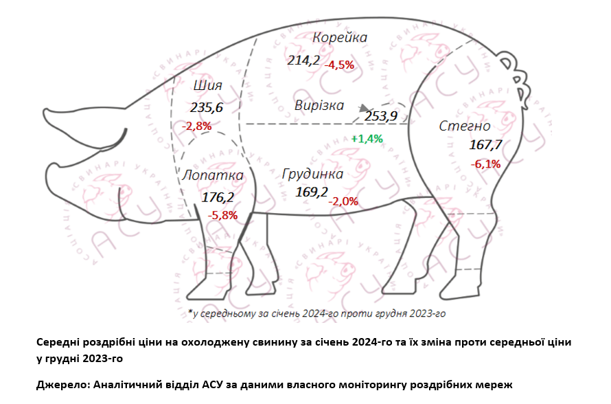 «Найпомітніше понизилися ціни на свинячі лопатку, стегно та корейку: так, середня ціна кілограма цих частину в січні більш ніж на 10 грн/кг знизилася порівняно з її грудневим рівнем (на 4,5–6%). Натомість, спад вартості грудинки та ошийку обмежився 2% та 2,8%, відповідно, тоді як ціна охолодженого стейка не змінилася, а вирізка, навпаки, додала 1,4%», — повідомляють в АСУ.