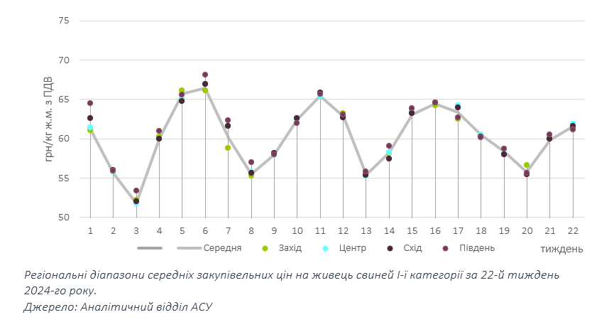 У ході цінових перемовин операторів ринку живця свиней ціни на свиней забійних кондицій переглянули на 1–2,5 грн/кг у бік підвищення. Зокрема, ціни закупівлі на основні товарні об’єми коливалися в межах 60–62 грн/кг, а ситуативно відхилення від цього діапазону не перевищувало 2 грн/кг. Середньоринкова ціна склала 61,6 грн/кг, додавши 2,5% до минулотижневої позначки.