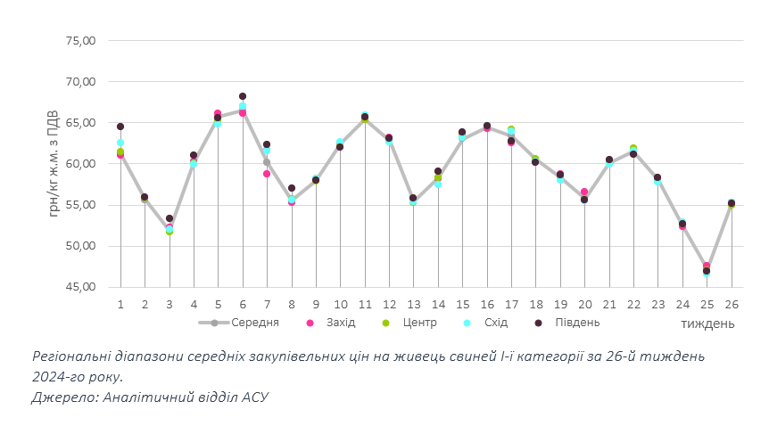 Цінові перемовини операторів ринку живця свиней забійних кондицій завершилися «розворотом» цінового тренду. Так, після раптового падіння у середині місяця, котирування частково надолужили втрачені упродовж червня позиції: більшість товарних партій цього тижня закуповували по 55-56+ грн/кг, хоча місцями озвучували як вищі, так і нижчі цінові пропозиції. Середньозважена ринкова позначка цього тижня склала 55,1 грн/кг.