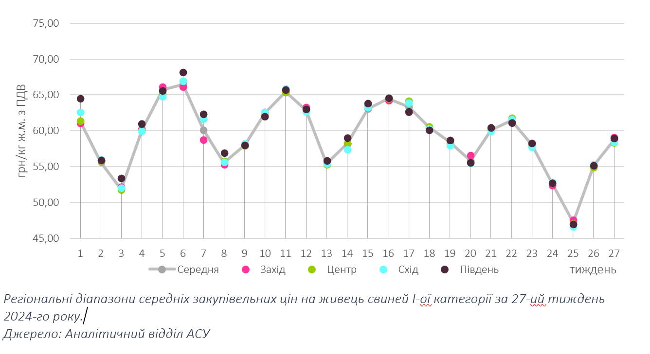 Торги минулого тижня завершилися переглядом цін закупівлі живця свиней на 2,5–4 грн/кг у бік підвищення, тож більшість товарних цього тижня закуповували по 58–60 грн/кг. При цьому, максимальна цінова позначка частіше зустрічалася у західних регіонах, тоді як епізодичні пропозиції нижче згаданого мінімуму озвучували в Східних областях та епізодично в Центрі. Середньозважена ціна закупівлі склала 58,7 грн/кг, що на 6,6% перевищує її минулотижневий рівень.