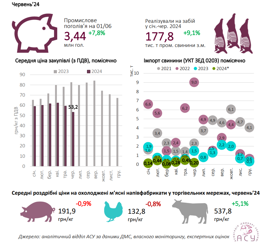 «Загалом 2024-ий став дуже нетиповим роком для зовнішньої торгівлі свининою, адже за розрив між обсягами надходження м’яса свиней з-за кордону та експортом української свинини не такий значний. Так, сукупний імпорт за січень–червень становить 1,63 тис. т, що у 3,5 раза менше за обсяги завезеного за першу половину 2023-го, а експорт за цей період лише на чверть менший — 1,2 тис. т — і вже перевищує торішні обсяги відвантажень на зовнішні ринки. За зниження цін на внутрішньому ринку, яке спостерігають у першій половині року, це цілком закономірно: нижча внутрішня ціна створює бар’єр входу для імпортної свинини і водночас сприяє покращенню конкурентних позиції продукції на зовнішніх ринках», — роз’яснюють в АСУ.