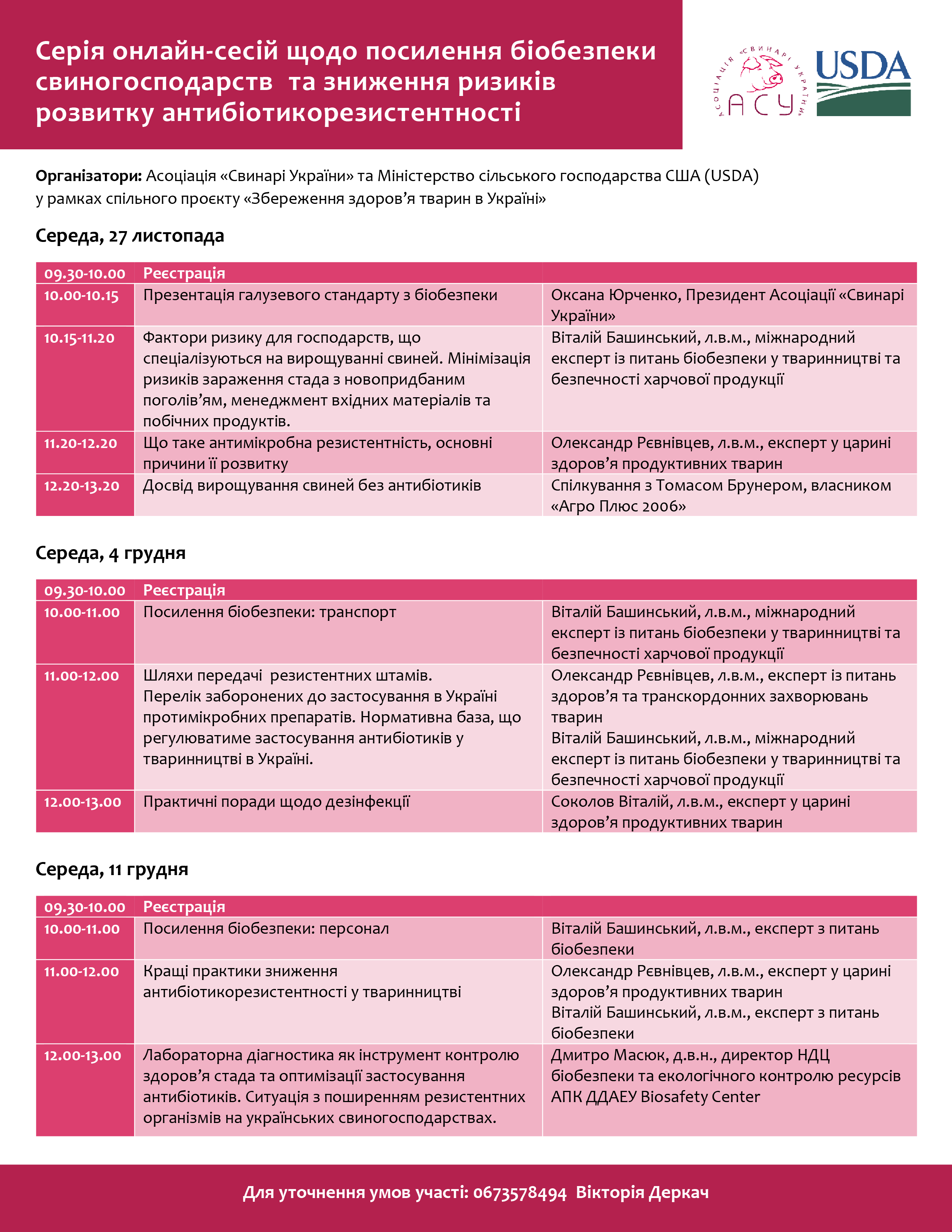 27 листопада, у ході першої онлайн-сесії з біобезпеки та боротьби з антимікробною резистентністю, Олександр Рєвнівцев, експерт у царині здоров’я продуктивних тварин, розповість про основні аспекти антимікробної резистентності (АМР), ключові чинники її виникнення та поширення. Організатори навчання — Асоціація «Свинарі України» та Міністерство сільського господарства США (USDA) у рамках спільного проєкту «Збереження здоров’я тварин в Україні».