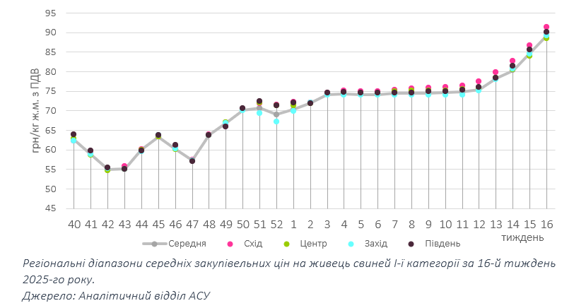 Жвава заготівля свинини напередодні Великодня на тлі ослабленої пропозиції кондиційного промислового живця сприяла подальшому росту котирувань. Так, більшість товарних партій живця цього тижня закуповували по 89–92 грн/кг. Оскільки епізодично зустрічалися дещо нижчі ціни, середньоринкова ціна тяжіє до нижньої межі діапазону та складає 89,2 грн/кг (+5,5% до минулотижневої).