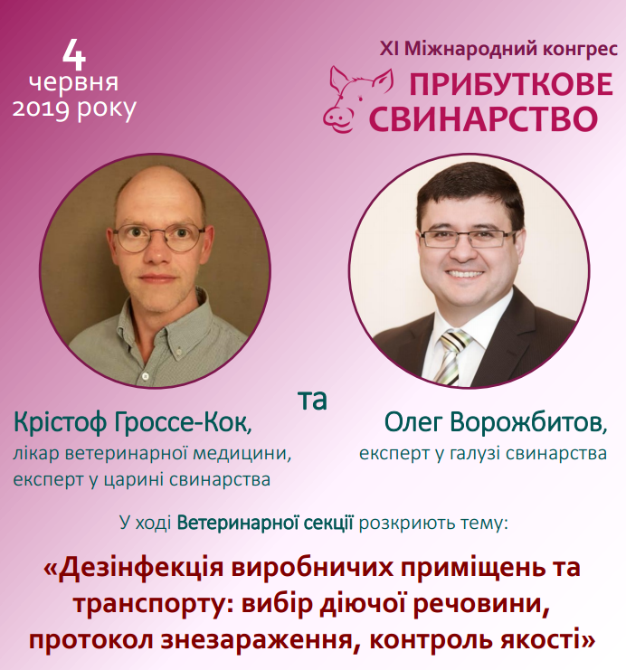 Про те, як обирати діючу речовину, яким має бути протокол знезараження та як контролювати якість виконаних процедур розкажуть Крістоф Гроссе-Кок, лікар ветеринарної медицини, експерт у царині свинарства (Нмеччина) та Олег Ворожбитов, експерт зі свинарства (Україна) у ході своєї презентації в рамках Ветеринарної секції конгресу «Прибуткове свинарство».