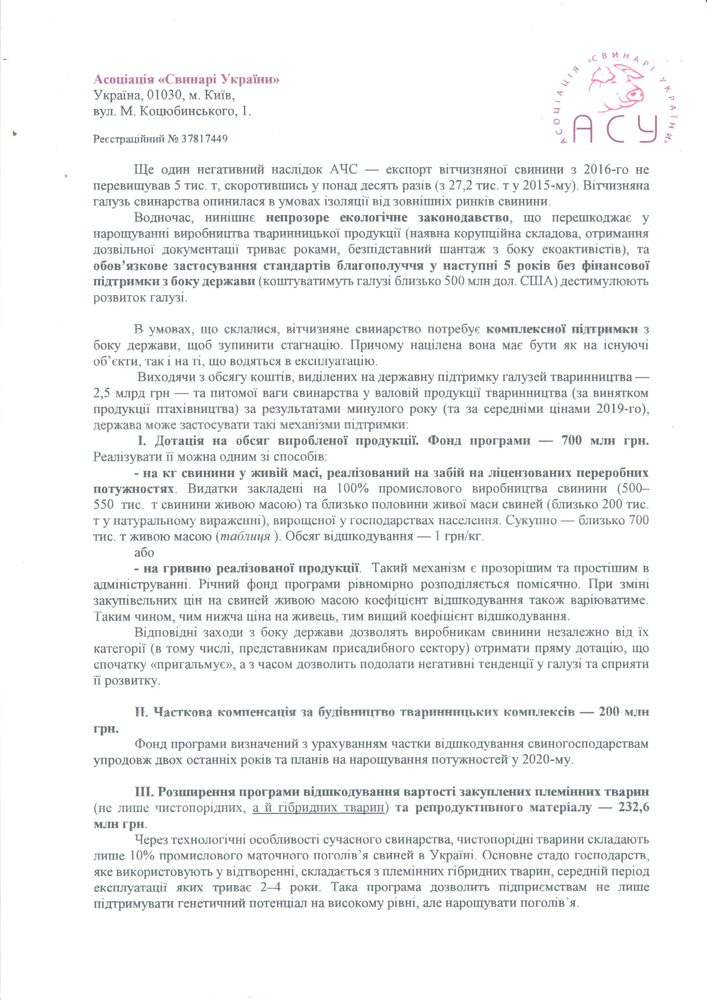 Детальніше про пропоновані програми підтримки, фонди та очікуваний ефект комплексної держпітримки вітчизняного свинарства — у листі.