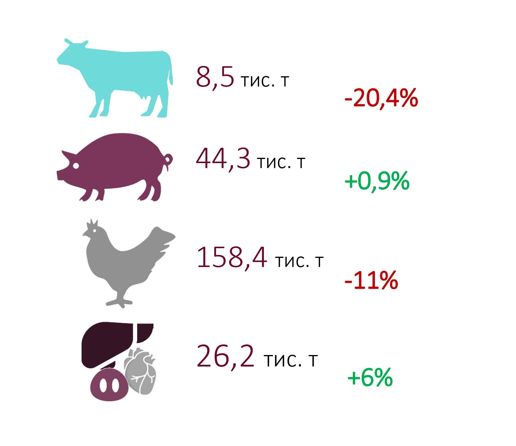 Так, головним «винуватцем» такого просідання стало менше виробництво м’яса птиці. Зокрема, мова йде про менше виробництва курячих морожених тушок та охолоджених їх частин тушок у порівнянні з аналогічним періодом минулого року: мінус 35,5% та 25,5%, відповідно, що сумарно зменшило обсяги виробництва м’яса птиці майже на 24 т. Обсяг виробництва морожених курячих частин у цей же час збільшився на 12% чи 6.1 тис. т (до 56,94 тис. т), в тому числі і завдяки приросту об’ємів виробництва за лютий більш ніж на 1/5. Проте це не змогло компенсувати втрат.