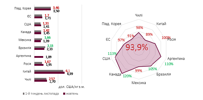 Хоча середня жовтнева ціна на свинину в США теж перевищила вересневу (+14%), проте причиною цього став ціновий пік у першій декаді місяця — 1,46 дол. США/кг з.м., що стало ціновим максимумом 2020-го. Після цього котирування «відкотилися» на десять центів до кінця місяця, а першу декаду листопада завершили на рівні 1,32 дол. США/кг. Ключовим фактором підтримки для цін залишається активна зовнішня торгівля свининою, зокрема з Китаєм, який тимчасово заборонив поставки цього виду м’яса з Німеччини, та менші ніж торік об'єми заморожених запасів на складах.