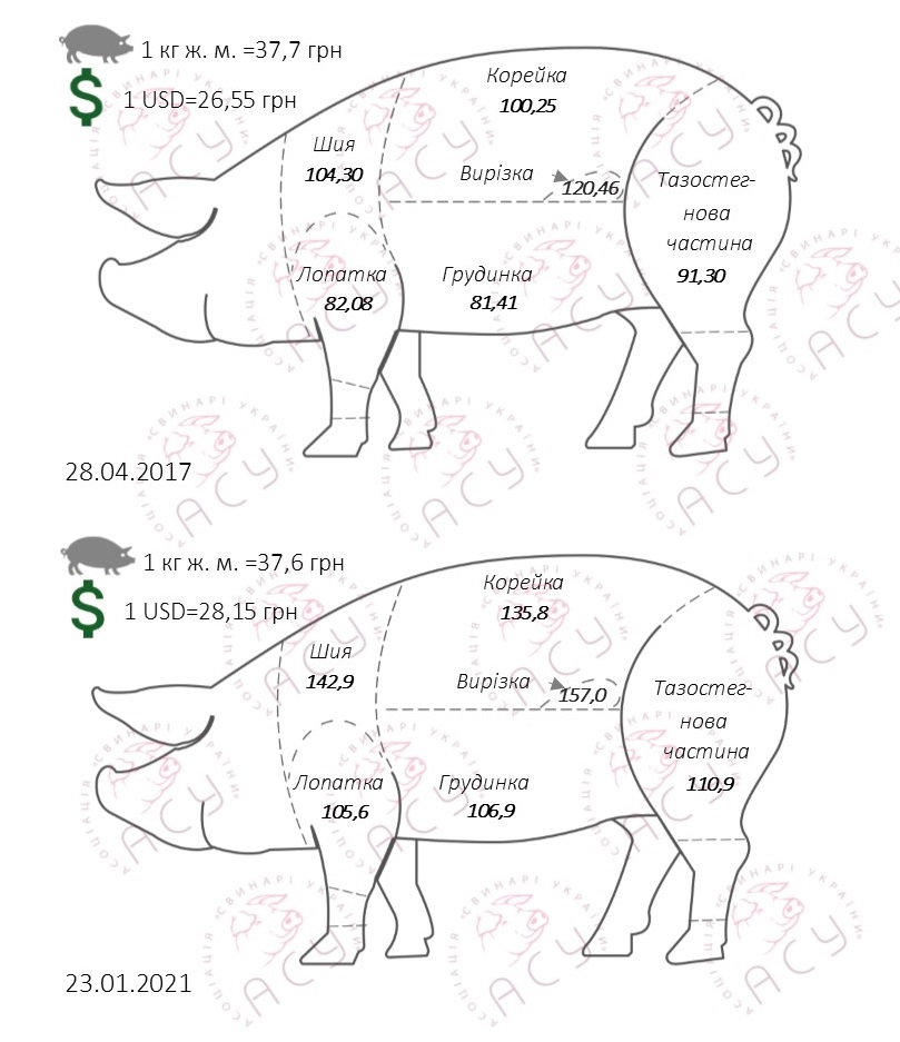 «Якщо «копнути» глибше, то нинішні закупівельні ціни співставні з показником кінця квітня 2017-го. Водночас кінцеві ціни на свинину тоді були значно помірніші: діапазон цін на основні м’ясні частини становив 80-105 грн/кг (зараз 105-147 грн/кг), і лише «преміальна» вирізка коштувала 120,5 грн/кг (зараз 157 грн/кг). Звичайно, існуючий рівень роздрібних цін відображає і девальваційній процеси (середній курс НБУ 28-го квітня 2017-го становив 26,55 грн за 1 дол. США проти 28,15 грн станом на 27-ме січня 2021-го) і загальні інфляційній процеси. Проте, відповідні загальноекономічні зміни відбилися і на промислових виробниках свинини. Тож закиди у їхній бік щодо високих споживчих цін на цей вид м’яса безпідставні та мають маніпулятивний характер. Виробники вже котрий місяць збиткують, а ціна на прилавку майже не змінюється», — коментують в АСУ.
