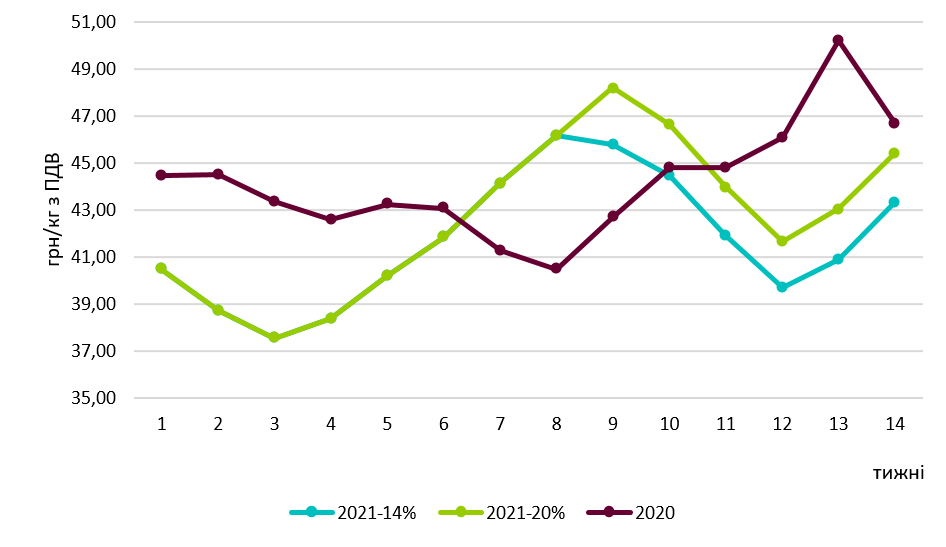 Зазначимо, що за підсумками першого кварталу 2021-го року ціни на свиней забійних кондицій на 5,9% нижче за аналогічний період минулого року: середня закупівельна ціна на живець у січні-березні склала 41,6 грн/кг проти 44,2 грн/кг рік тому.