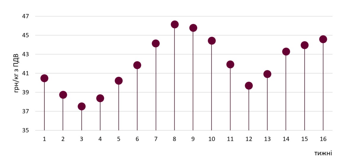 Так, планові ціни реалізації підвищилися на 0,25-1 грн/кг, тож нижня межа цьоготижневого коридору цін піднялася до 44 грн/кг. Максимальна позначка закупівельних цін залишилася на рівні минулого тижня (45 грн/кг), а середній показник додав 1,3% чи півгривні — 44,6 грн/кг.