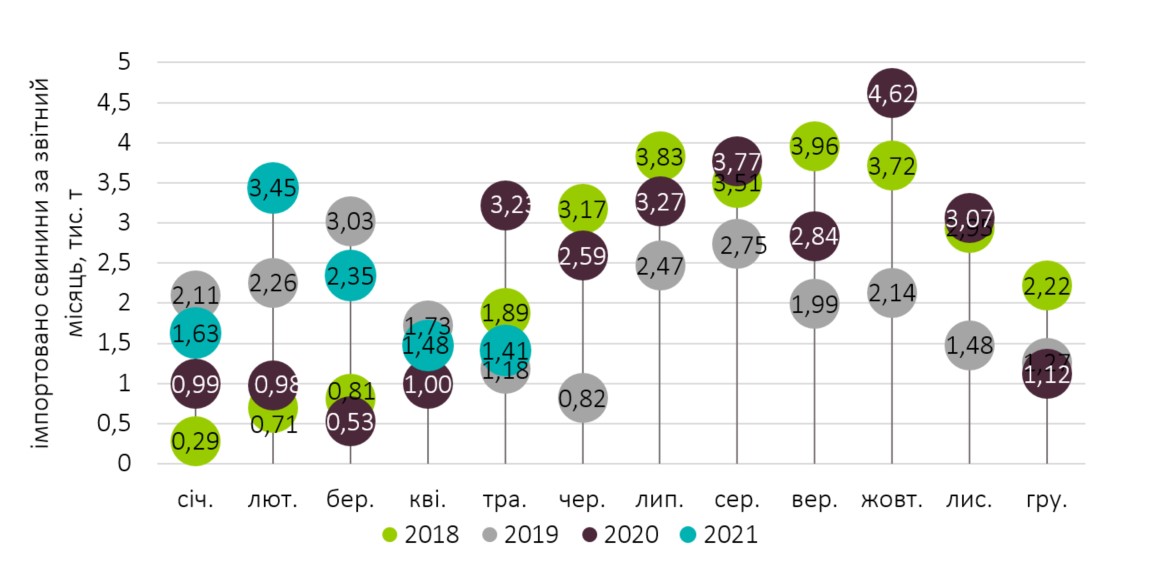 Згадані обсяги імпорту на третину перевищують надходження свинини з-за кордону аналогічного періоду 2020-го, та, водночас, співпадають з підсумками імпорту в січні-травні у 2019-го. При цьому, аналітики галузевого об’єднання зауважують, що надходження імпортної свинини у другому кварталі відчутно послабилося: «Понад 70% завезеної за п’ять місяців свинини надійшло саме у січні-березні, тоді як в останні два місяці поставки були менш активними — 1,4-1,5 тис. т/міс. Це менше за середньомісячні темпи надходження свинини за останні три роки».