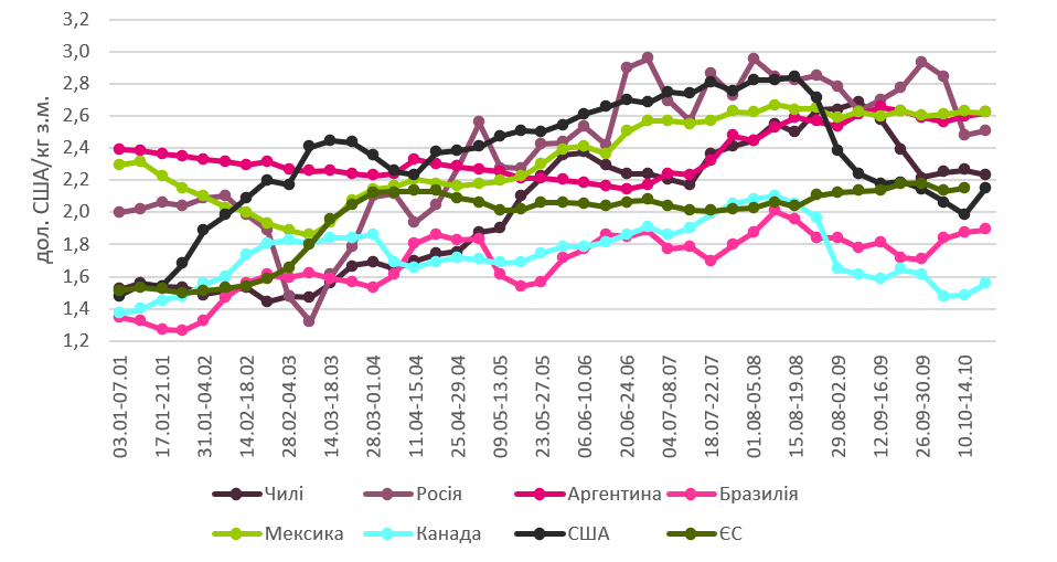 Ціни на свинину в окремих країнах світу, дол. США/кг забійною масою